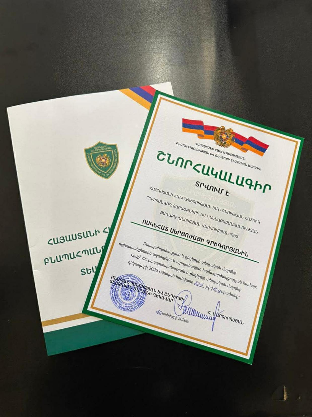 Միջոցառմանը Շրջակա միջավայրի նախարարության բնության հատուկ պահպանվող տարածքների և կենսաբազմազանության քաղաքականության վարչության պետ Ոսկեհատ Գրիգորյանին տրվել է Բնապահպանության և ընդերքի տեսչական մարմնի աշխատանքներին աջակցելու և արդյունավետ համագործակցության համար շնորհակալագիր։