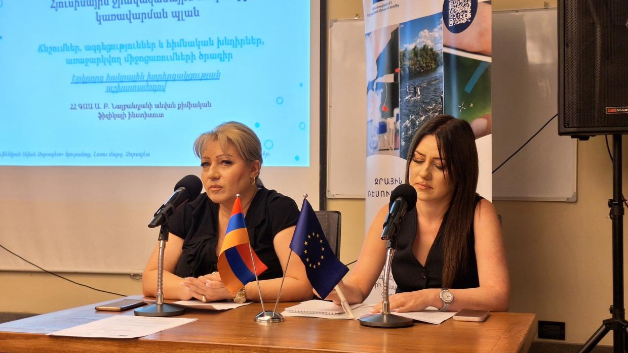 The public consultation meeting was co-chaired by Lilit Abrahamyan, Head of the Department of Water Policy of the Ministry of Environment, and Gayane Hovspeyan, Head of the Department of Water Resources of the Ministry of Environment.