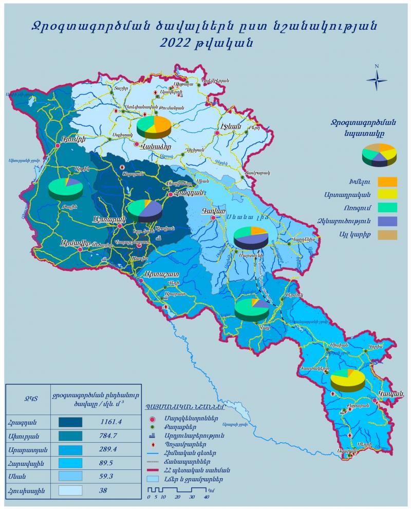 2022 թվականին ՀՀ-ում փաստացի ջրառը (առանց ՀԷԿ-երի) կազմել է 3071.7 մլն. մ³, փաստացի ջրօգտագործումը` 2422.3մլն. մ³, որից`